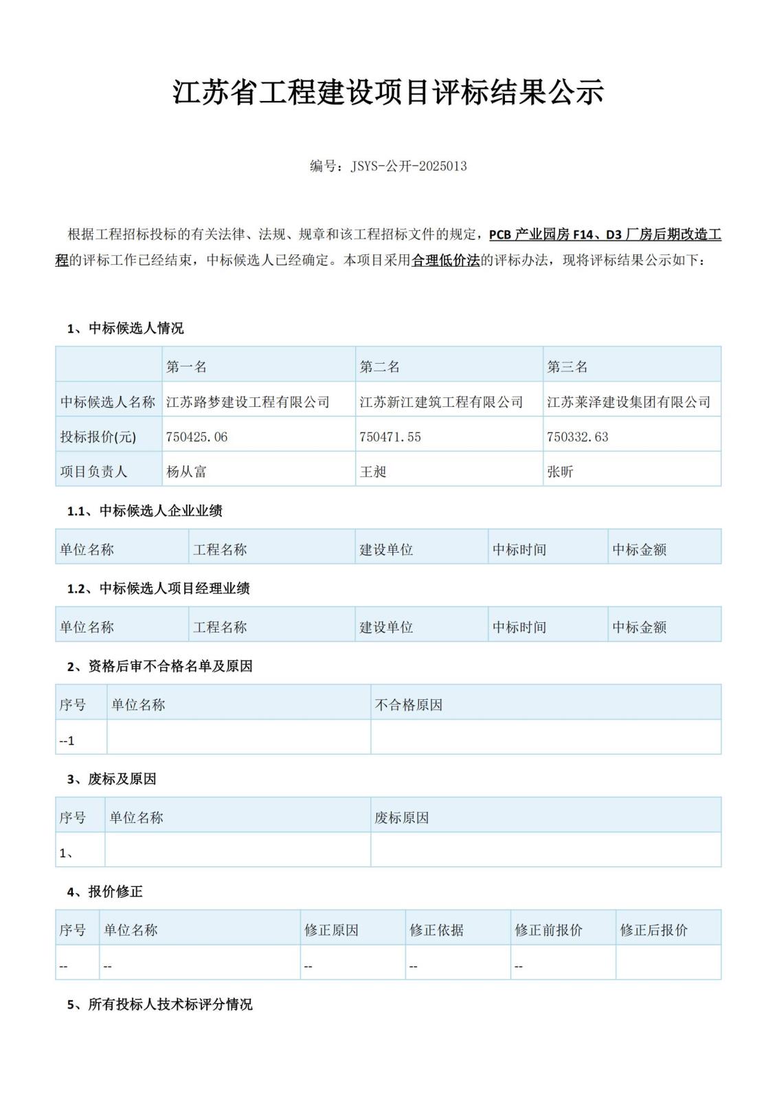 江蘇省工程建設項目評標結果公示